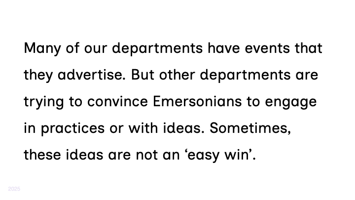 During my eighteen months in the Student Affairs Division at Emerson College, part of my role was organizing content for the quarterly all-hands meeting. As my work progressed, we implemented new design factors to support both presenters and audiences — new clarity around expectations for accessibility, breaks and standing periods.